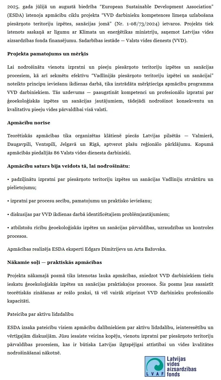 Eiropas Ilgtspējīgas attīstības asociācija (ESDA) ir sekmīgi pabeigusi Latvijas vides aizsardzības fonda finansētā projekta “Valsts vides dienesta darbinieku kompetences līmeņa paaugstināšana piesārņoto vietu izpētes un sanācijas jomā”, kas īstenots sadarbībā ar Klimata un enerģētikas ministriju un Valsts vides dienestu (VVD), izpildi.